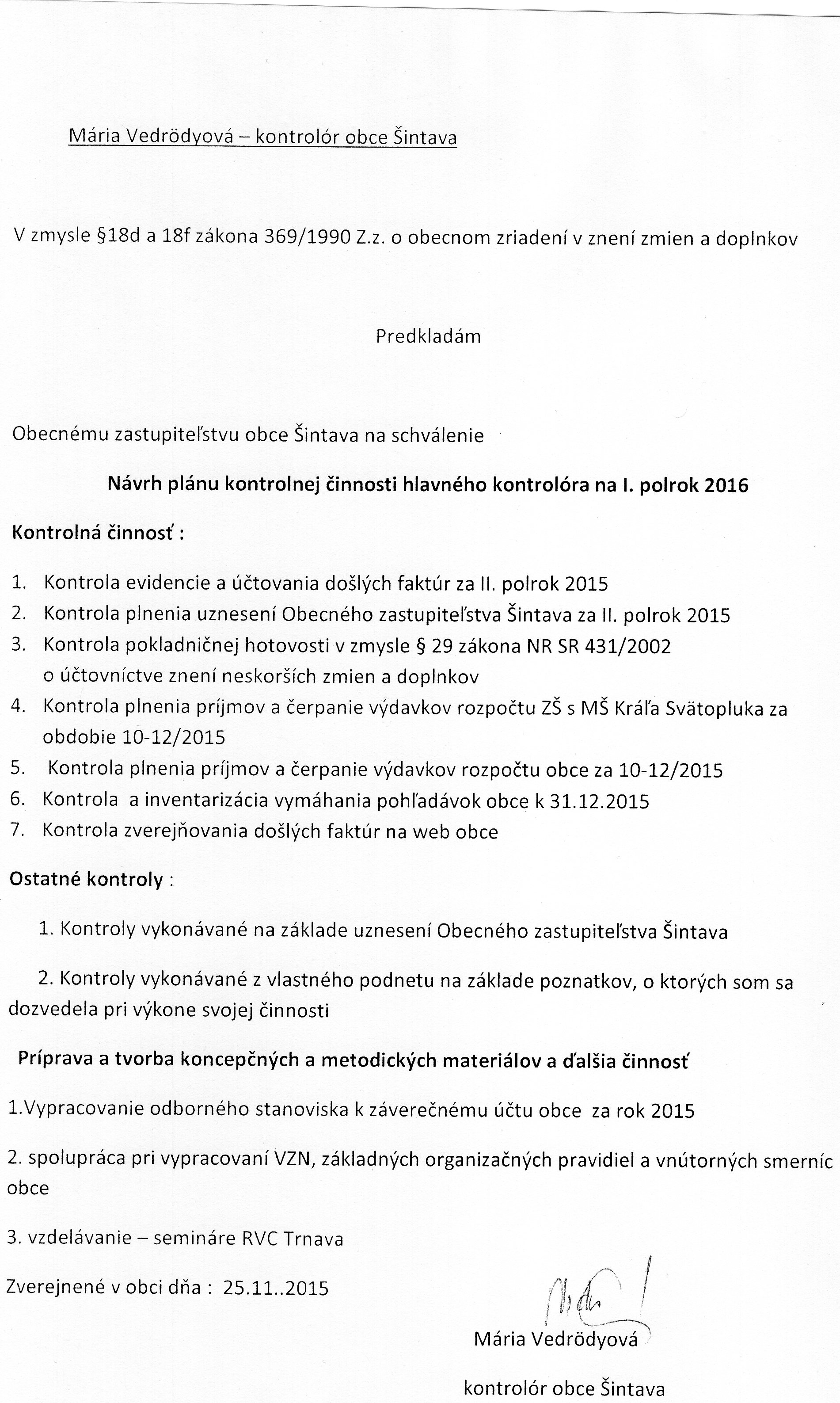 Návrh plánu kontrolnej činnosti hlavného kontrolóra na II. polrok 2015